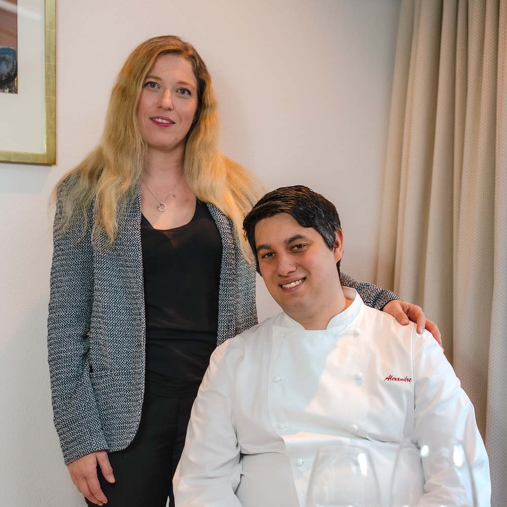 Alexandre, cuisinier valaisan, a fait ses armes auprès de chefs tels que Didier de Courten et Bernard Ricoux, avant de diriger les cuisines de l’Hôtel de la Poste à Sierre. Élodie, son épouse, veille avec naturel et bienveillance à l’accueil et à l’ambiance en salle, dans un esprit d’attention simple et sincère.